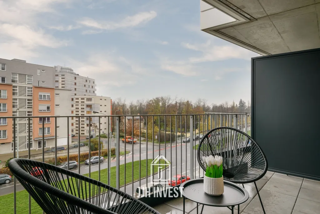 Součástí nájmu je také prostorný sklep (5,4 m²). K bytu je možné pronajmout parkovací stání v podzemních garážích za 2.500 Kč/měsíc.
