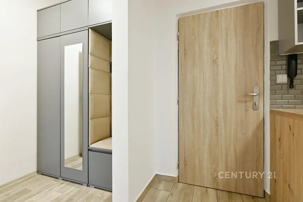 Chytrá dispozice: Kuchyňská linka je efektivně umístěna v předsíni, díky čemuž zůstávají oba pokoje plnohodnotně využitelné jako samostatná ložnice a obývací pokoj. Jeden z pokojů nabízí praktický výklenek pro šatnu nebo domácí pracovnu (viz vizualizace).