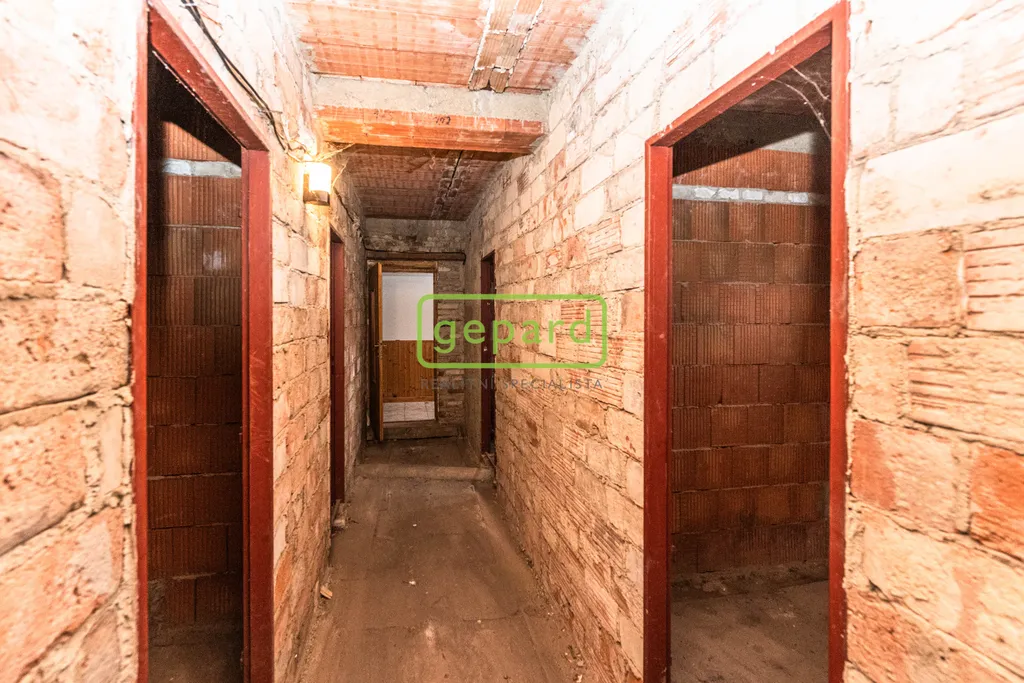 1. NP. – chodba s dřevěným schodištěm do podkroví, 3 pokoje, kuchyně, koupelna (rohová vana, WC a 2 umyvadla) a chodba se vstupem na zahradu a do rozestavěných prostor – chodba, garáž, 2 místnosti, skladovací a technická místnost, sociální zařízení.