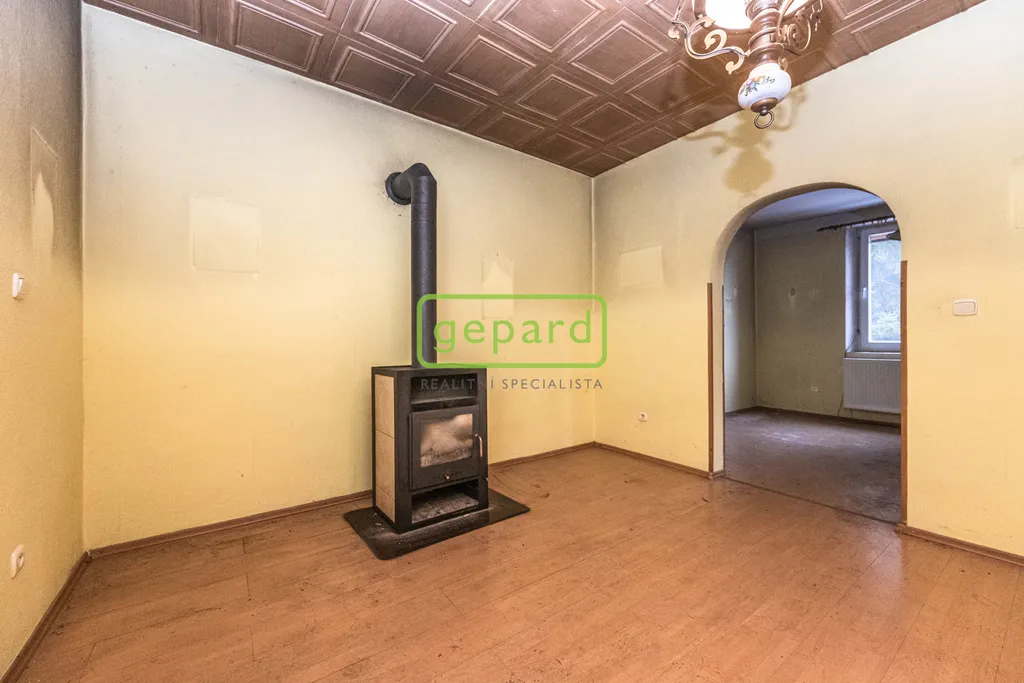 Na zahradě dřevěný altán a kolna na dříví a několik okrasných a ovocných stromů (smrky, túje, jabloně, třešeň, višeň, špendlík, ořech atd.).