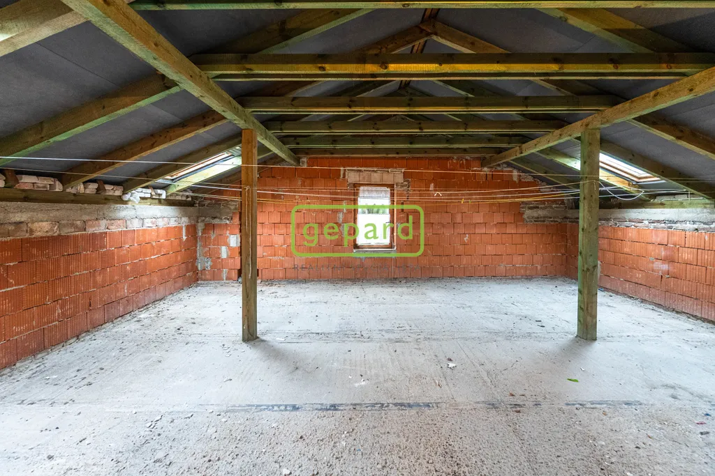 Podkroví – chodba s vchodem na terasu, 2 pokoje, kuchyně, koupelna (sprchový kout, WC a umyvadlo), terasa a nedokončená obytná část o 2 velkých místnostech.