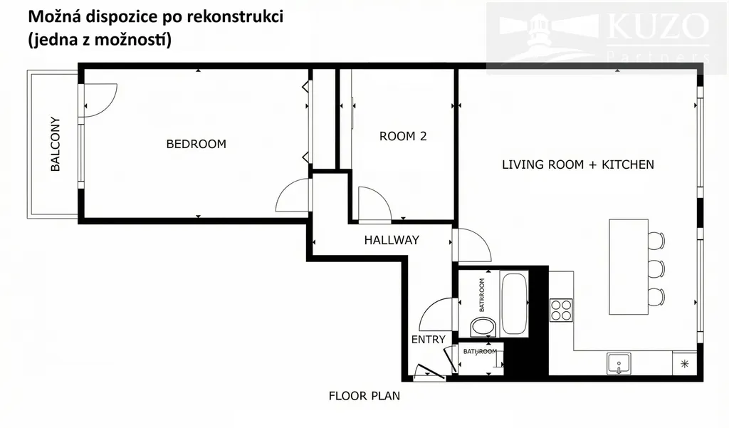 Vzhledem k tomuto nadstandardnímu prostoru a vhodnému rozvržení se nabízí možnost úpravy dispozice na moderní a ergonomické 3+kk.