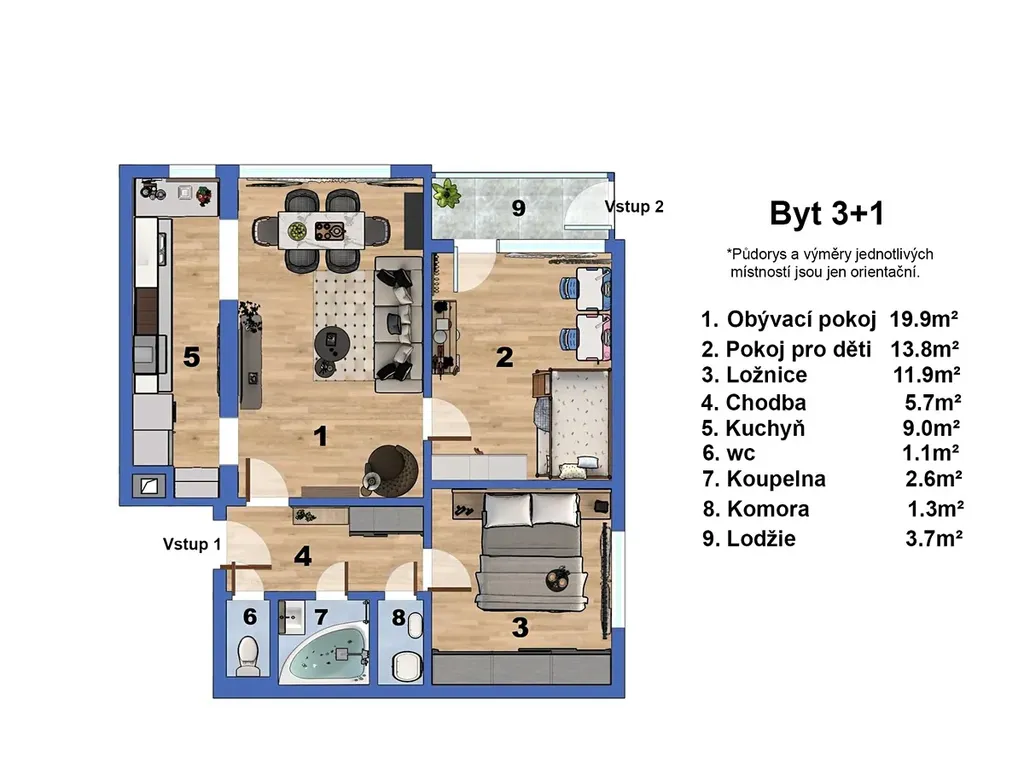 Velkým benefitem je lodžie (3,7 m²), ze které je možné jít přímo ven — praktické například pro kočárek, kolo.