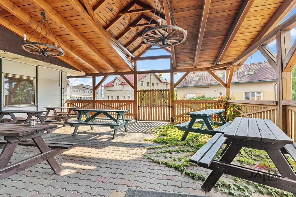 K nemovitosti patří venkovní zahrádka o ploše 80 m² s kapacitou 36 míst. Je částečně zastřešená a vybavená funkčním zděným grilem a udírnou – ideální pro letní provoz a grilování.