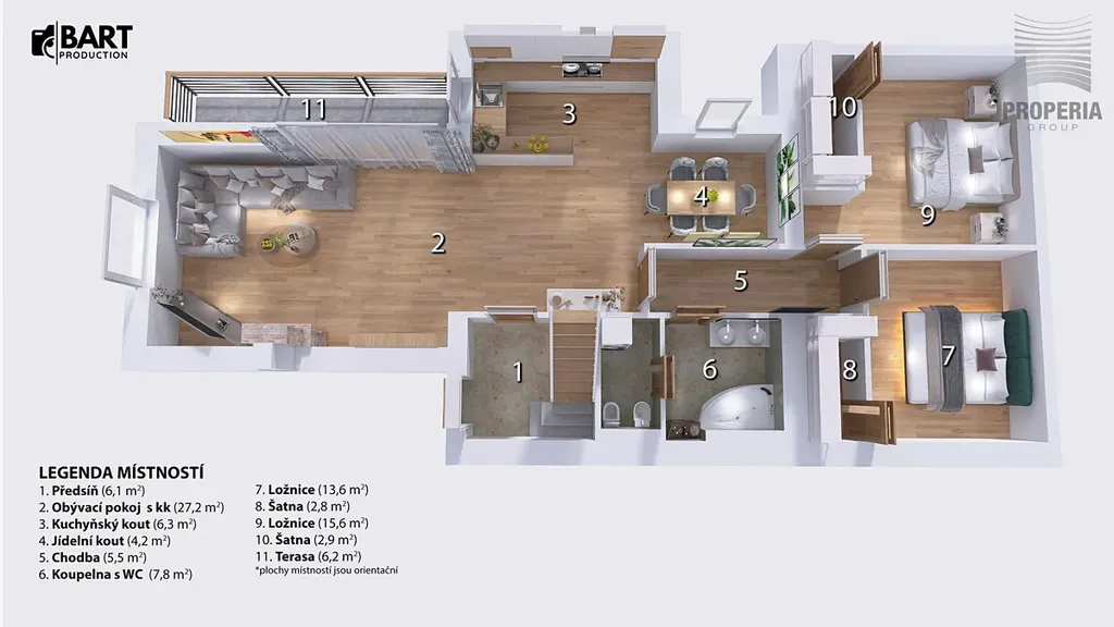 Byt disponuje dvěma koupelnami, velkým množstvím úložných prostor a komfortním zázemím i pro náročnější klientelu. Každá ložnice má vlastní šatnu. Zajímavým architektonickým detailem je částečně skleněná podlaha v patře.