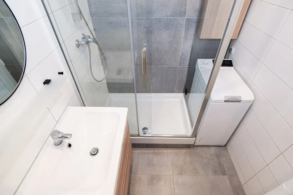 Koupelna disponuje proskleným sprchovým koutem, umyvadlem s úložnou skříňkou, zrcadlem a galerkou. Je zde pračka s vrchním plněním. Toaleta je samostatná.