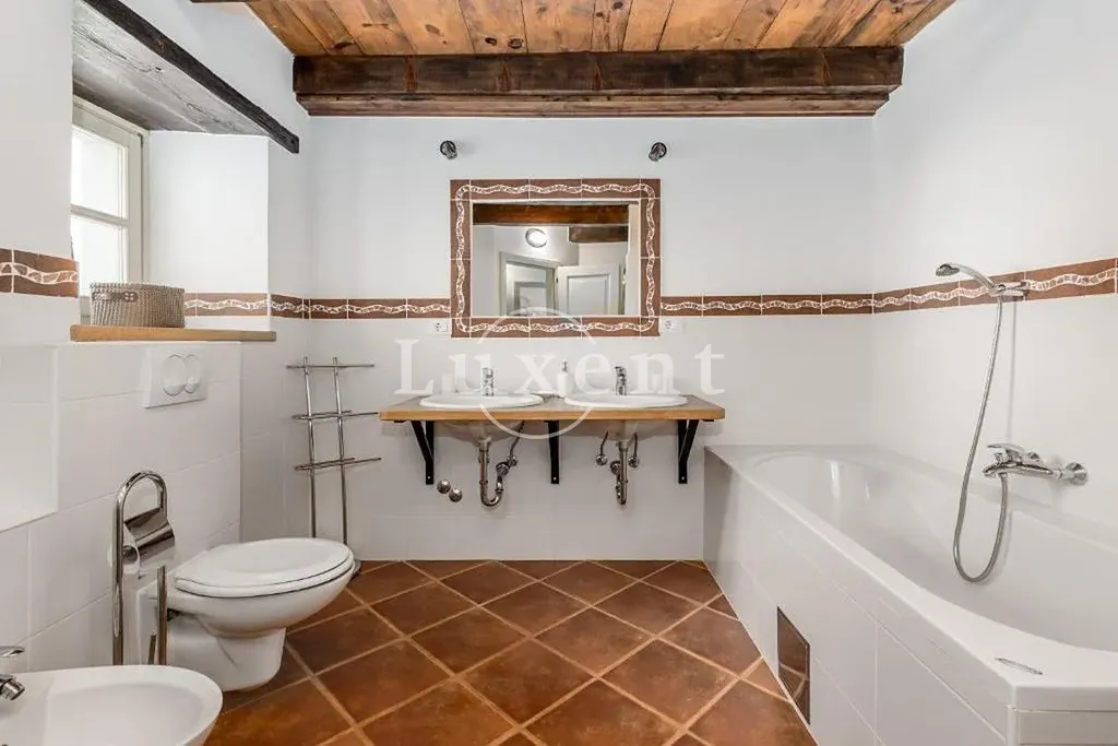 Interiéry byly citlivě zrekonstruovány s důrazem na detail a zachovávají pravý istrijský charakter. V přízemí najdete prostorný obývací pokoj s krbem, který plynule navazuje na plně vybavenou kuchyni a jídelní část – ideální pro rodinné setkání či zábavu s přáteli. Dům disponuje třemi velkými klimatizovanými ložnicemi, každá s vlastní koupelnou, šatnou a balkónem s výhledem do zeleně a částečným výhledem na moře. Rozvržení zajišťuje maximální komfort a soukromí, což dělá dům vhodným pro větší rodiny nebo skupiny.