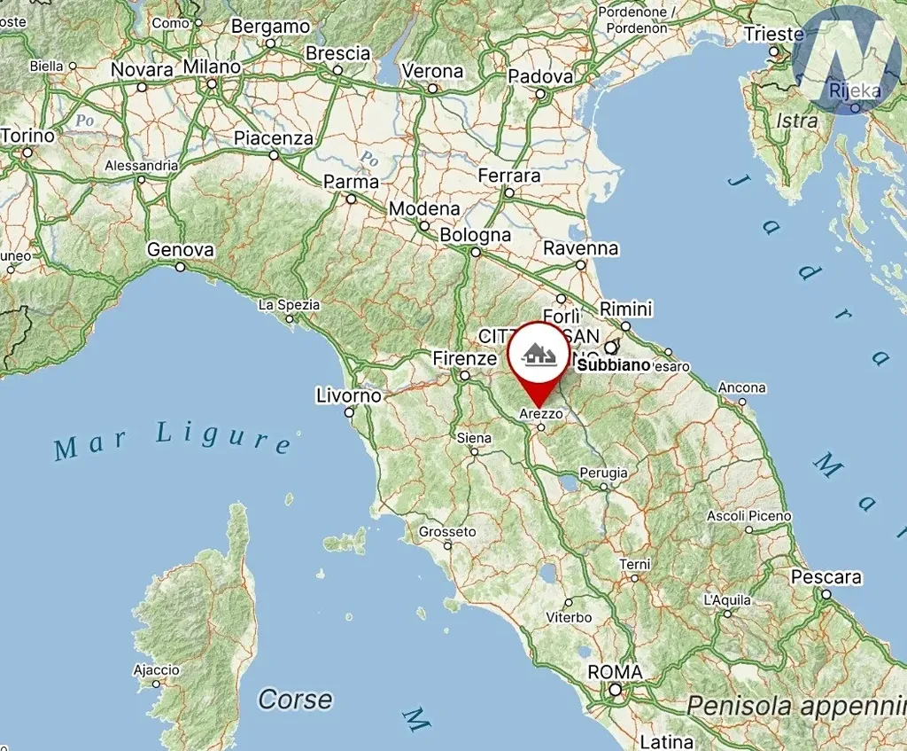 Tato nemovitost se nachází v obci Subbiano, na strategickém místě, které kombinuje klid absolutní samoty s výbornou dostupností po asfaltová cestě. Poloha na kopci nabízí nádherné výhledy na údolí Casentino, které patří k nejzelenějším a nejmalebnějším koutům Toskánska. Je to oblast proslulá svými uzeninami, zejména šunkou z Casentina. Za 15mi dojedete do historického města Arezzo, můžete navštívit nedaleký národní park Foreste Casentinesi, nebo majestátní hrad Poppi či klášter La Verna, kde působil svatý František.