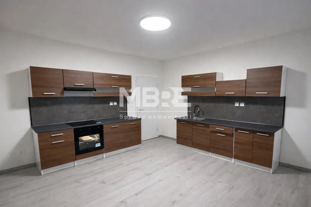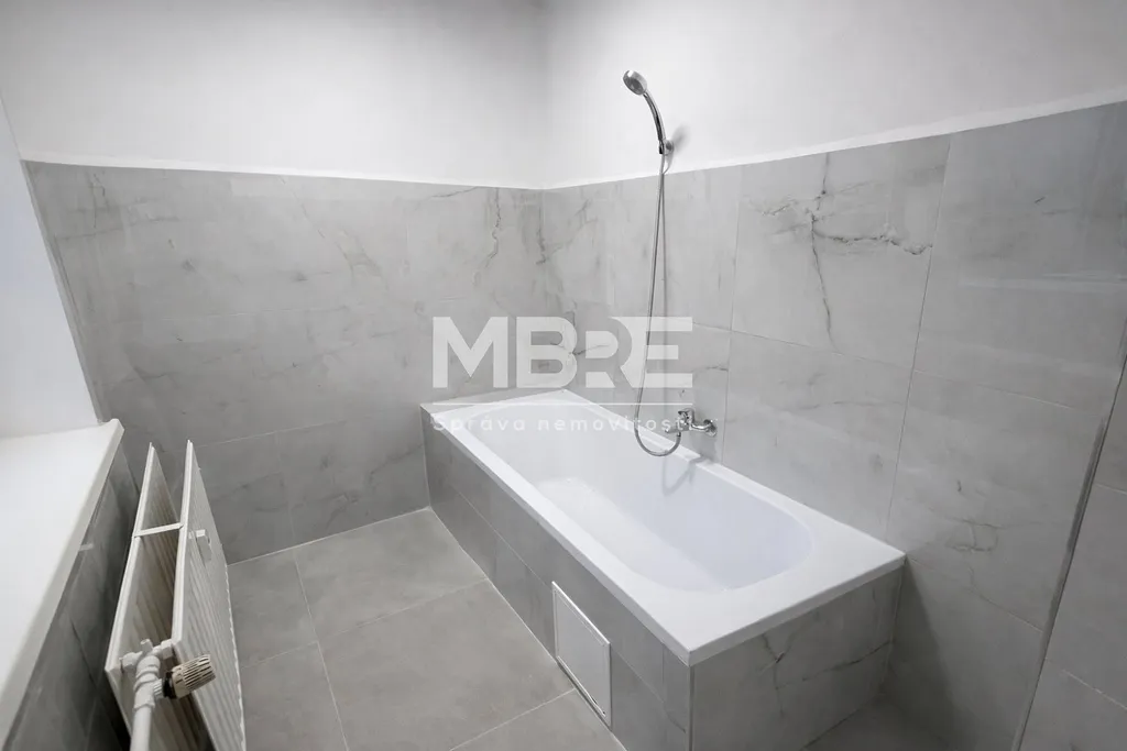 Dominantou bytu je opravdu nadstandardně velká kuchyň, která nabízí dostatek prostoru nejen pro vaření, ale i pro společné stolování. Kuchyňská linka je vybavena vestavnými spotřebiči – troubou, varnou deskou, myčkou nádobí a digestoří a bez problémů se zde vejde i opravu velký jídelní stůl. Koupelna je moderně řešena vanou a topným žebříkem.