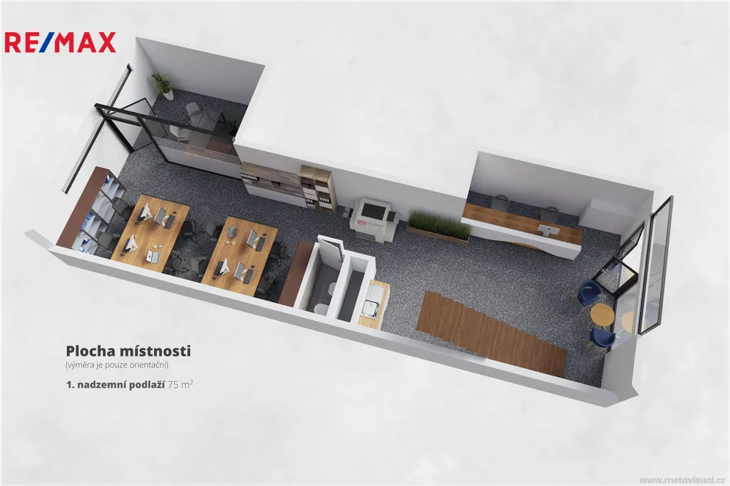 Obchodní prostor je v 1NP o velikosti 75m2 a MEZANIN o velikosti 35 m2.