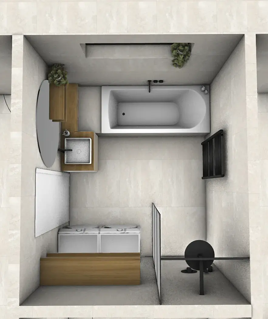 Koupelna je vybavena sprchovým koutem i vanou, WC je oddělené. Podlahy jsou řešeny kombinací kvalitního vinylu a dlažby.