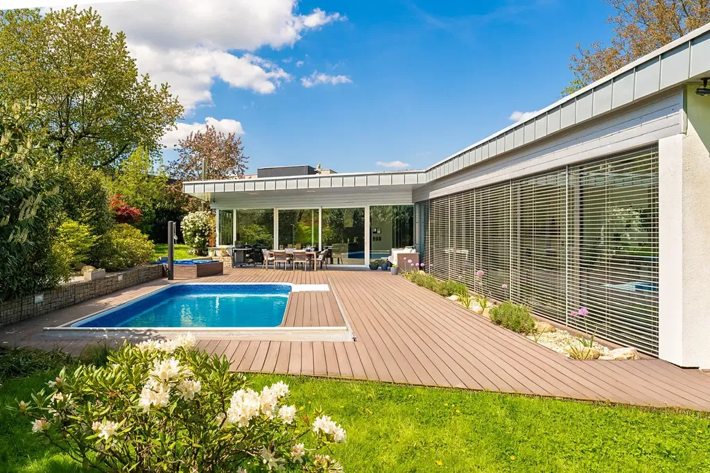 V tomto domě si budete užívat relaxaci na nejvyšší úrovni. Vyhřívaný bazén s protiproudem a venkovní Whirlpool vám umožní dopřát si wellness každý den. Dvě zastřešené terasy, jedna u obývací haly a druhá u ložnice, poskytují klidné místo pro odpočinek v soukromí.