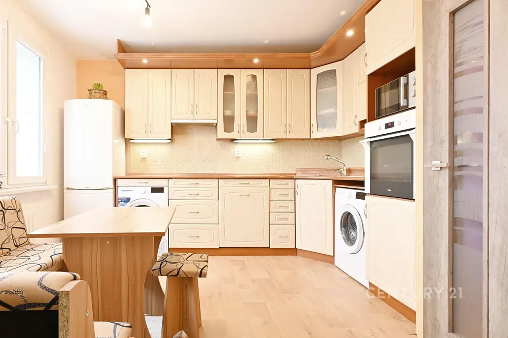 • Kuchyňská linka plně vybavená vestavnými spotřebiči (elektrická trouba se sklokeramickou deskou, digestoř, pračka, myčka, sušička, mikrovlnná trouba a volně stojící lednice)