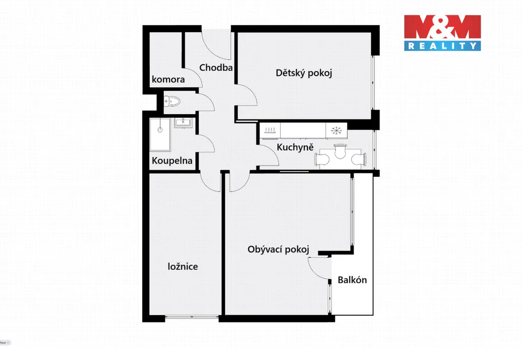 Dispozice bytu nabízí tři neprůchozí pokoje (obývací pokoj, dětský pokoj a ložnici). Z obývacího pokoje je vstup na prostorný balkón. Byt má samostatné WC a koupelnu po rekonstrukci se sprchovým koutem. V bytě se nachází také komora, která je vhodná na umístění pračky a sušičky. V suterénu domu se nachází prostorný zděný sklep a společná kolárna.