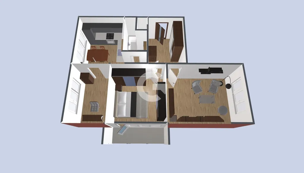 Dispozice bytu je velmi praktická a vzdušná. Nabízí tři neprůchozí pokoje, které jsou v současnosti využívány jako ložnice se vstupem na zasklenou lodžii, obývací pokoj a pracovna. Toto uspořádání zajišťuje dostatek soukromí a flexibility. Součástí je zasklená lodžie o ploše 3,5 m², ideální pro posezení či relax, a sklep o velikosti 4,5 m², který poskytuje dostatek úložného prostoru. Byt je orientován na jihozápad, což zajišťuje dostatek denního světla po většinu dne.