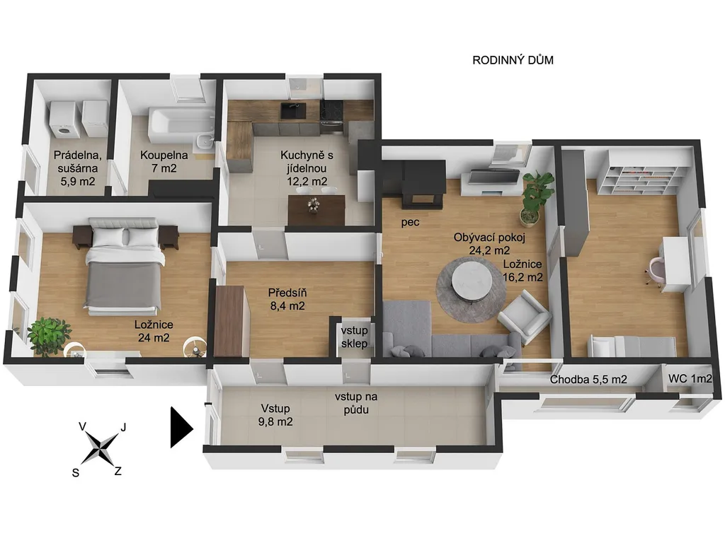 • Rodinný dům s dispozicí 3+1, podlahová plocha přízemí 114,2 m², půda vhodná k vestavbě obytných prostor 125,5 m², sklep 11 m²