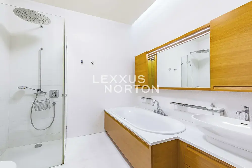 Součástí bytu je plně vybavená kuchyně se sporákem, troubou, lednicí, mrazákem a myčkou nádobí. K zařízení dále patří pračka se sušičkou, internetové připojení, satelit a zabezpečovací alarm. Byt disponuje dvěma koupelnami, které jsou vybaveny sprchovým koutem, vanou, bidetem a toaletou. V obytných místnostech jsou dřevěné parkety, koupelny mají kvalitní keramickou dlažbu. Vytápění je plynové, přičemž v koupelnách je instalováno komfortní podlahové vytápění.