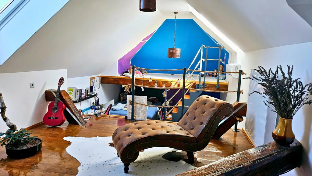 Pokoj s galerií - přízemní prostor (19 m²) , prostor v mezipatře (9m²), a dětský koutek (5m²). Na tento prostor navazuje pokoj v podkroví s vlastní toaletou (cca 23 m²)