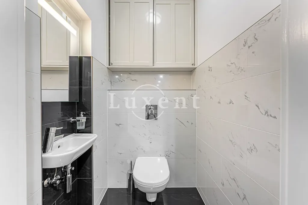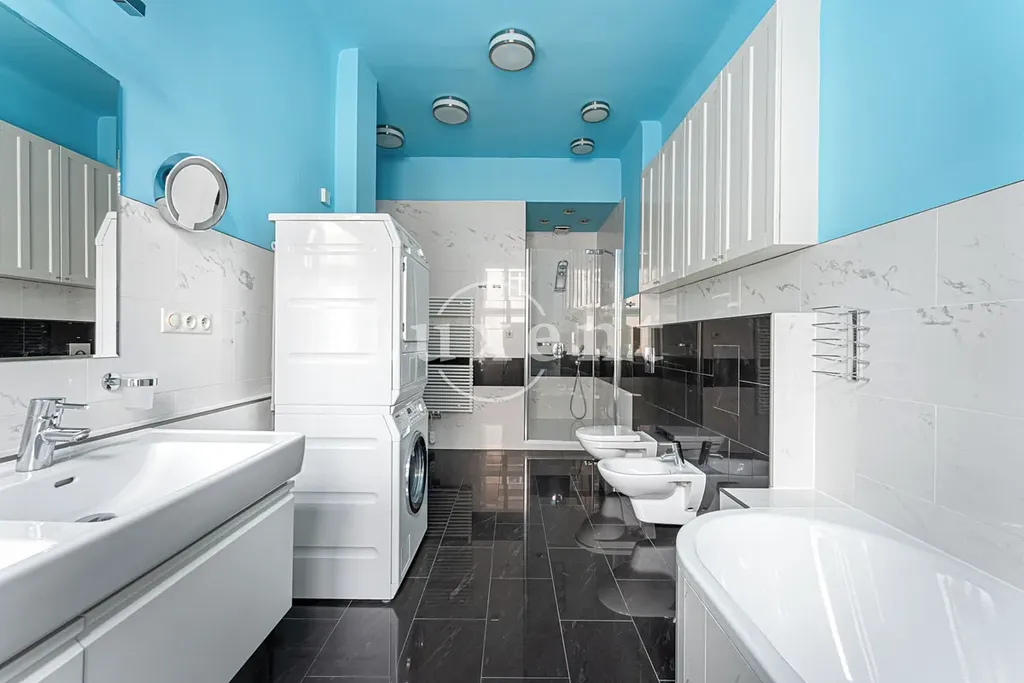 Celková plocha bytu činí 118 m² a je doplněna dvěma lodžiemi o velikosti 3 m² a 4,4 m². Dispozice bytu je prakticky řešena a ideální pro rodinné bydlení. Byt se skládá ze vstupní haly, samostatné kuchyně s jídelním koutem, prostorného obývacího pokoje, hlavní ložnice se šatnou, dvou dalších pokojů, samostatné toalety a velké koupelny vybavené vanou, sprchovým koutem, dvěma umyvadly, toaletou a bidetem. Součástí koupelny je také pračka se sušičkou. V bytě se dále nachází komora s vlastním plynovým kotlem a zásobníkem na ohřev vody.