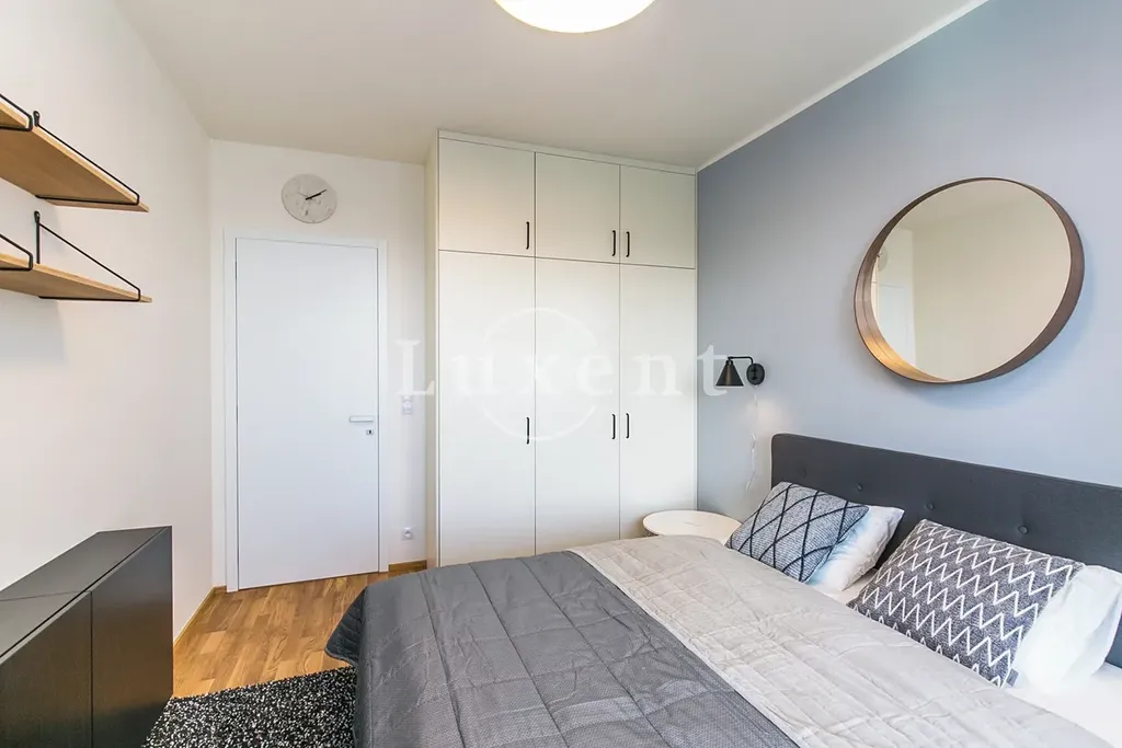 Z obývacího pokoje i ložnice je vstup na terasu s posezením. Nonstop recepce s ostrahou a doplňkovými službami, bezpečnostní dveře, kvalitní francouzská okna s trojskly, pračka se sušičkou. Dřevěná podlaha a vyhřívaná dlažba v koupelně. Mnoho úložných prostor a vestavěný nábytek na míru.