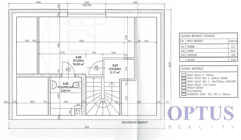 V podkroví je 3. ložnice (16,53 m2) a 3. koupelna s vanou a s WC.