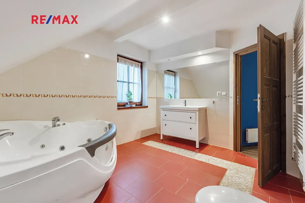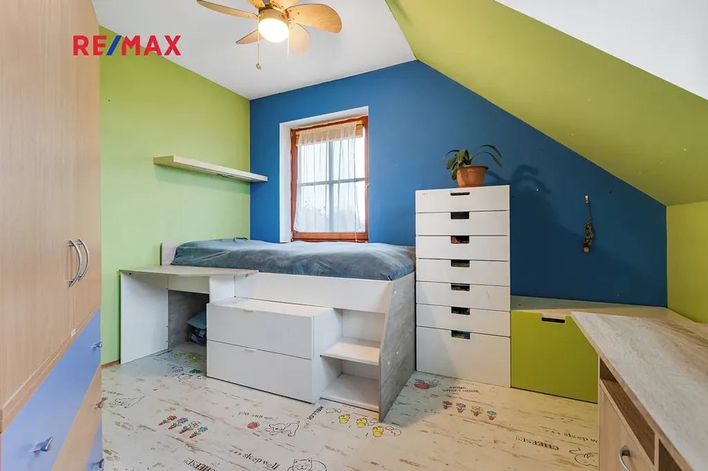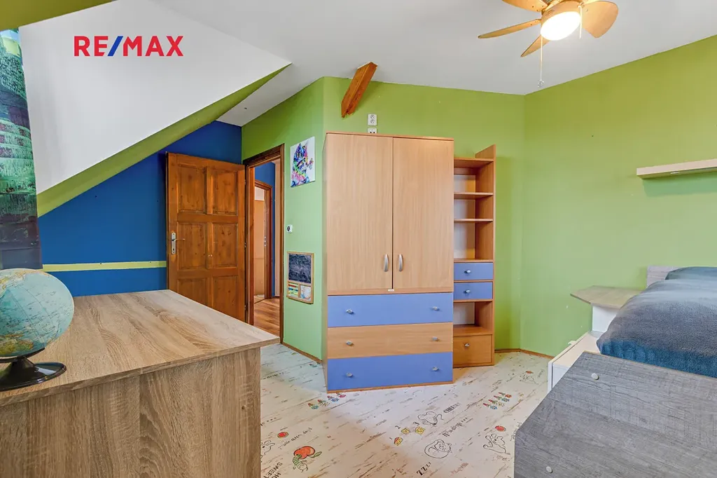 V horním patře se nachází čtyři samostatné pokoje a druhá koupelna. Patro je řešeno jako klidová část domu, vhodná pro ložnice, dětské pokoje nebo pracovnu.