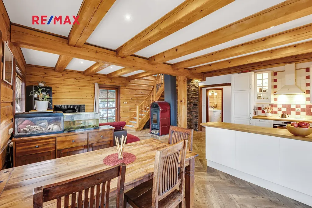 V přízemí se nachází vstupní zádveří s prostorem pro uložení bot a oblečení, koupelna, technické zázemí a velká komora vhodná například pro skladování potravin nebo zavařenin. Hlavní část přízemí tvoří prostorný otevřený obytný prostor s kuchyní, jídelnou a obývacím pokojem. Dominantou obývací části jsou kachlová kamna na dřevo, která slouží jako plnohodnotný zdroj tepla a zároveň vytváří velmi příjemnou atmosféru.
