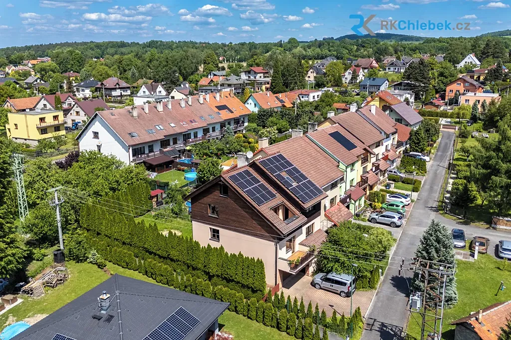 Jsou zde tři terasy, které nabízí možnost odpočinku a venkovního posezení. K dispozici je také velká garáž, která je vybavena sprchovým koutem a záchodem, což ocení zejména ti, kteří tráví čas v dílně či pracují na různých projektech. K dispozici je rovněž velký sklep. Dům je vybaven fotovoltaickým systémem s bateriemi, což přispívá k velkým úsporám na energiích a k ekologickému způsobu života. Aby bylo možné pohodlně nabíjet elektromobily, nachází se zde rovněž nabíječka na dva elektromobily najednou. Vytápění objektu zajišťují topné panely, voda je řešena bojlerem. Plyn je přiveden až k domu, ale není zde využíván. Dům je napojen na obecní kanalizaci.