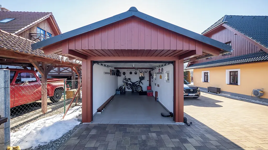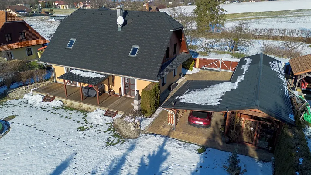 Kolem domu se nachází dostatek zpevněných ploch z betonové zámkové dlažby, včetně krytého parkování pro dvě vozidla. Na vlastním pozemku před domem je navíc prostor pro parkování dalších až šesti automobilů. Pro uložení sportovního vybavení, zahradního náčiní a dalších potřeb slouží dřevěná hospodářská stavba. Pozemek je kompletně oplocen a vjezd je zajištěn elektrickou posuvnou bránou.