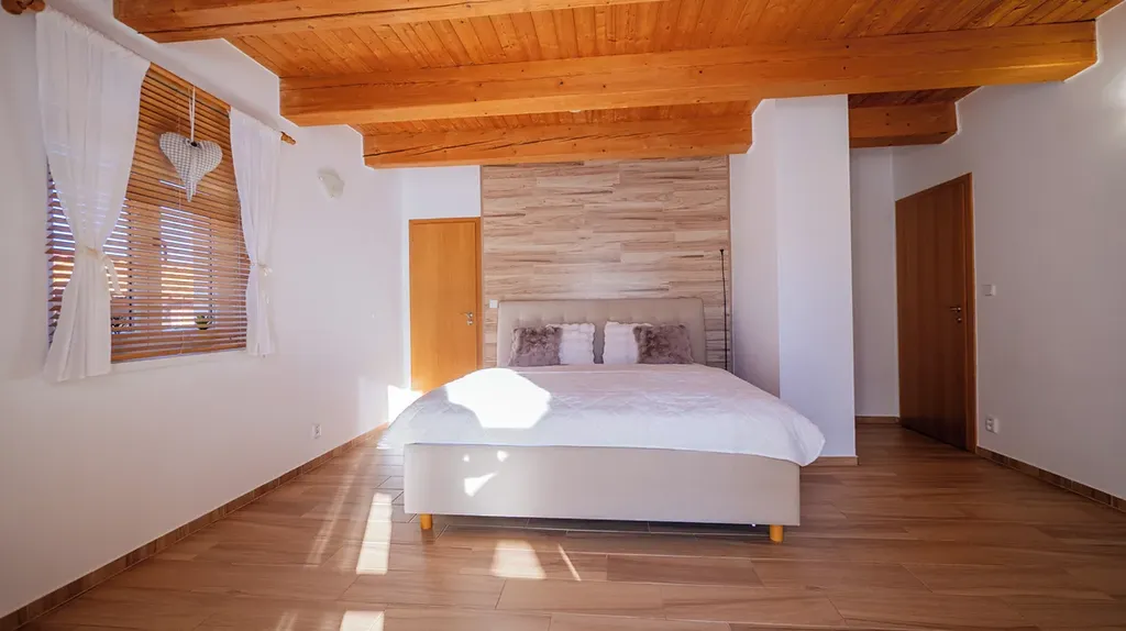 V přízemí domu se nachází prostorný obývací pokoj s kuchyňským koutem a přímým vstupem na terasu, ložnice s vlastní koupelnou a toaletou, komora, druhá koupelna s toaletou, vstupní veranda a schodiště do druhého podlaží z masivního dřeva. Ve druhém podlaží domu se nachází tři samostatné ložnice, koupelna, WC a vstup na půdní prostor vhodný ke skladování.