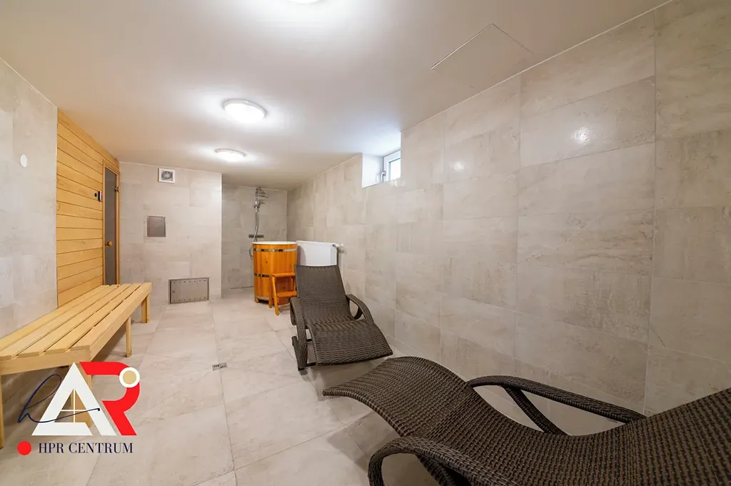 1. PP: sklep/sklad prádla, chodba, WC, technická místnost, wellness se saunou, společenská místnost s kuchyňským koutem, úklidová komora