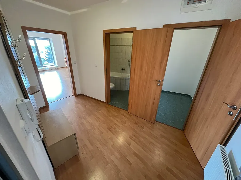 Byt se pronajímá jako částečně zařízený - plně vybavená kuchyňská linka, stůl, židle, stolek pod TV. Z chodby vcházíme do komory, koupelny s vanou a WC, pokoje s plně zařízenou kuchyňskou linkou a z něj poté do ložnice.