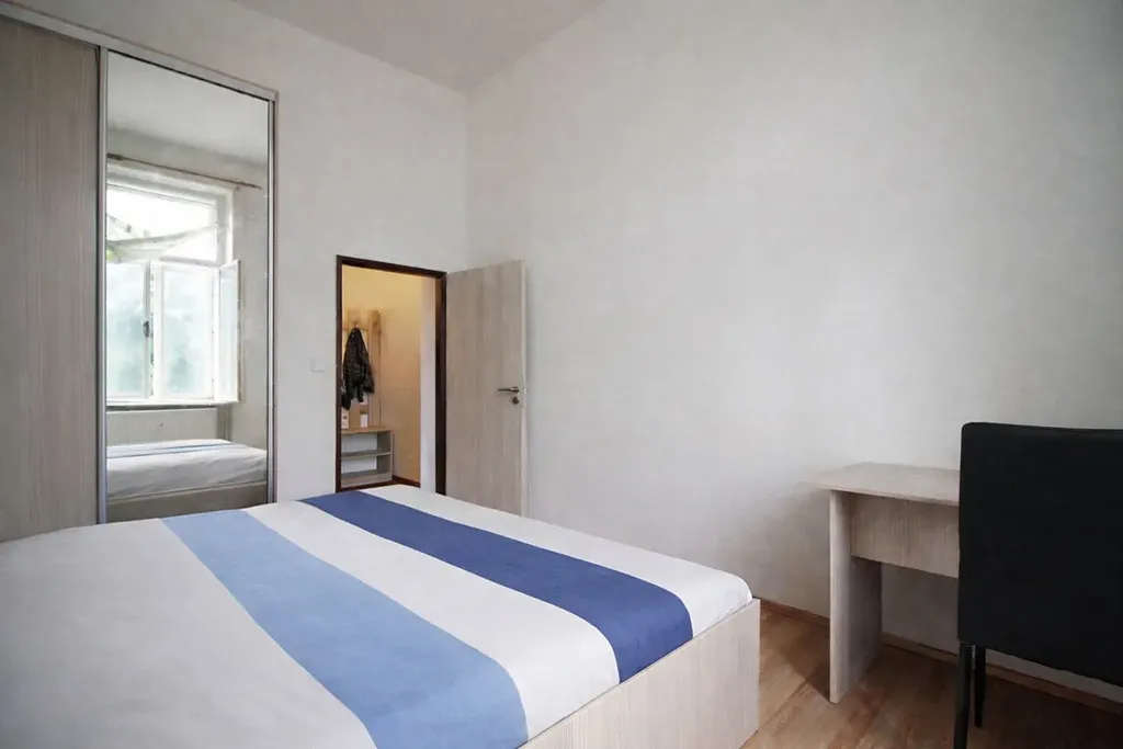 Každý pokoj je vybaven dvojlůžkovou postelí, šatní skříní a psacím stolkem se židlí.