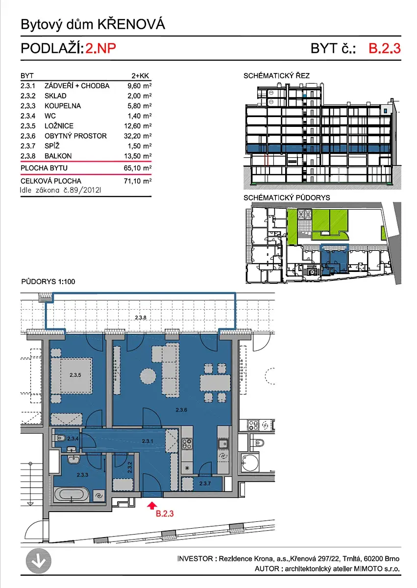 Nabízíme k pronájmu novostavbu bytu 2+kk v osobním vlastnictví o výměře 71 m2 s balkonem 13,5 m2. Byt se nachází ve 2.np nově postaveného domu na ulici Křenová 538/22.