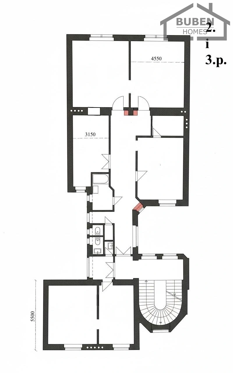 2.NP schodiště a dvě bytové jednotky: 3+1 o užitné ploše 127 m2 a jednotka 4+kk o ploše 67 m2.