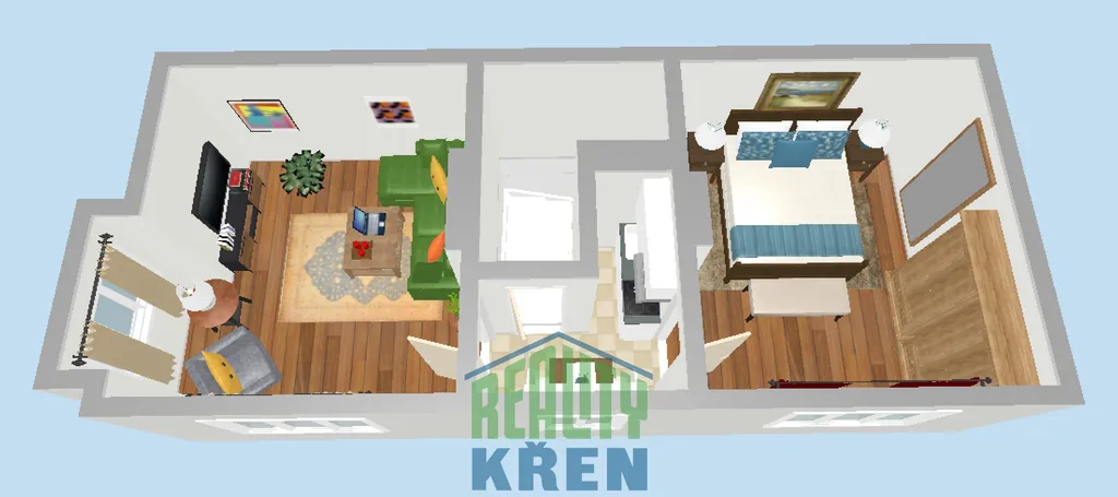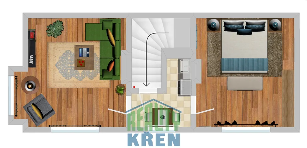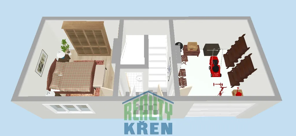2. NP (43 m2): 2x pokoj, malá kuchyň;