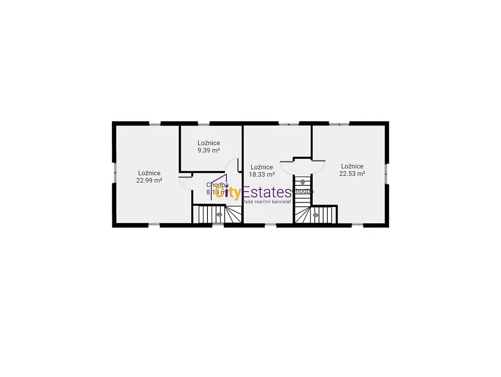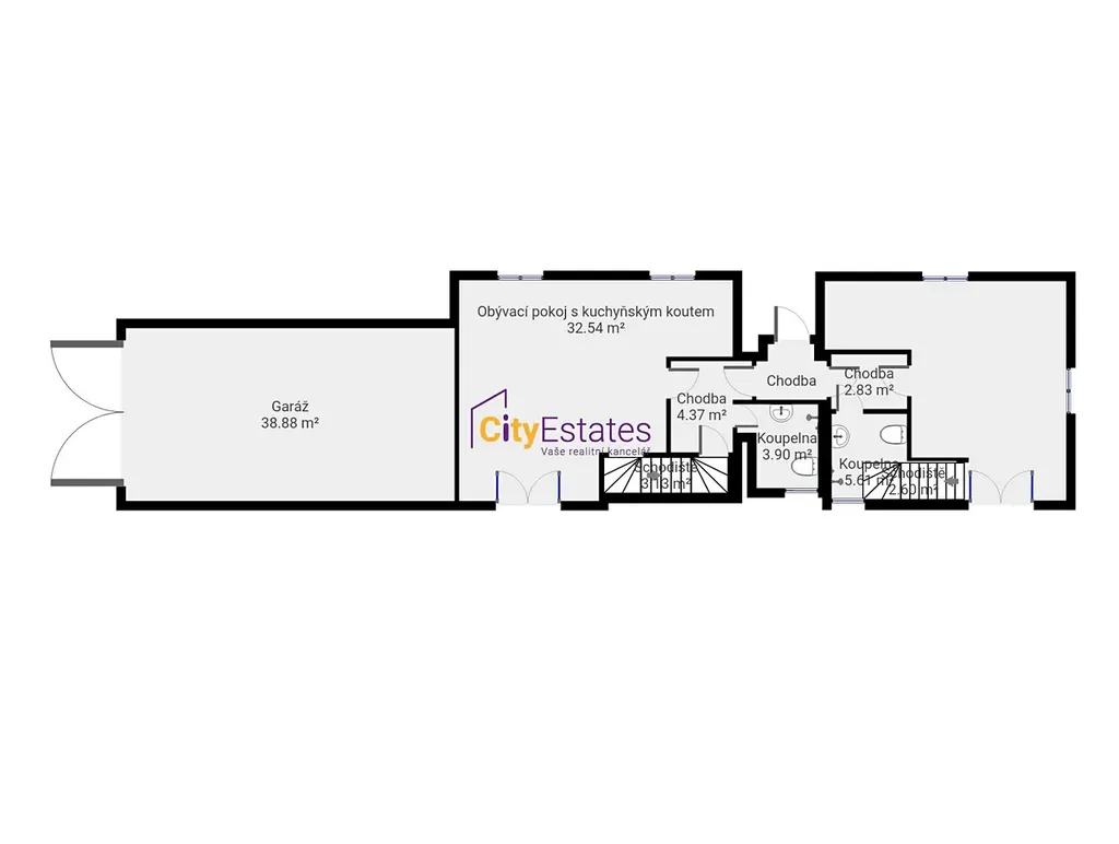Byt má podlahovou plochu 84m2, největším pokojem je obývací pokoj s kuchyňským koutem o výměře 32 m2. V přízemí se ještě nachází koupelna s toaletou. V patře jsou dvě ložnice.