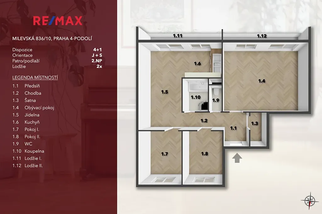 Byt je po rekonstrukci před nedávnou dobou, velkou ozdobou jsou parkety bez prahů vedoucí do ložnic, obýváku, kuchyně i chodeb. Obývák je tak velký, že by zde snadno mohla vzniknout ještě jedna ložnice. Nebo by se zde návratem k původním dveřím mohl obnovit přístup do kuchyně a v jídelně by mohla být třetí ložnice. Teď je to ale krásný velkorysý prostor se dvěma ložnicemi, obývákem s výstupem na lodžii, samostatnou kuchyní a jídelnou, která je srdcem bytu a má výstup na druhou lodžii. Velkým bonusem bytu je walk in šatna v předsíni. Koupelna je samostatná a najdete tu jak sprchový kout, tak vanu.