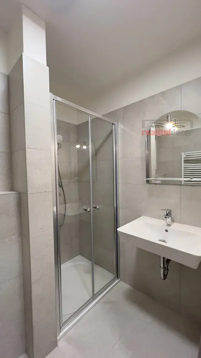 Koupelna je vybavena sprchovým koutem, umyvadlem se zrcadlem a LED osvětlením. V celém bytě je podlahové vytápění, v obytné části vinylová podlaha a v koupelně dlažba. K dispozici je také domácí telefon s elektrickým vrátným.
