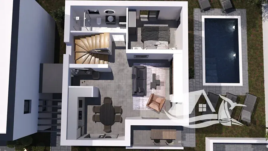 Dům je vybaven klimatizací pro celoroční komfort, kvalitními PVC okny a dveřmi s dobrou tepelnou i zvukovou izolací a připraveným zázemím pro pohodlné fungování bez nutnosti dalších investic. Projekt zároveň počítá s možností vybudování soukromého bazénu, jehož realizace záleží na preferencích budoucího majitele.