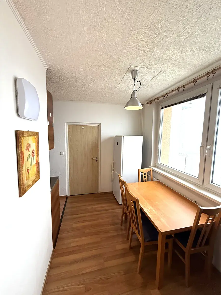 Po vstupu do bytu je zde velmi prostorná chodba (8 m²) s vestavnými skříněmi, která zpřístupňuje jednotlivé místnosti v bytě. Dále se zde nachází hlavní obytný prostor (17 m²), ložnice s dvojlůžkem a velkou skříní (15 m²) a třetí pokoj (15 m²) vybavený postelí, gaučem, stolem a dalšími skříněmi. Součástí bytu je také jídelna s jídelním stolem a židlemi (8 m²) a kuchyně (5 m²) s velmi pěknou kuchyňskou linkou (lednice s mrazákem, trouba, plynový vařič, myčka, dřez, digestoř). Dále je k dispozici koupelna (3 m²) s vanou, umyvadlem, zrcadlem a pračkou a samostatná toaleta (1,5 m²). Praktickým benefitem v bytě je komora s vestavěným regálovým systémem (3 m²). Byt disponuje také balkonem o výměře 4 m². Bytový dům je zateplený a je v něm výtah. Vytápění je zajištěno ústředním dálkovým vytápěním s otopnými tělesy (radiátory) v jednotlivých místnostech.