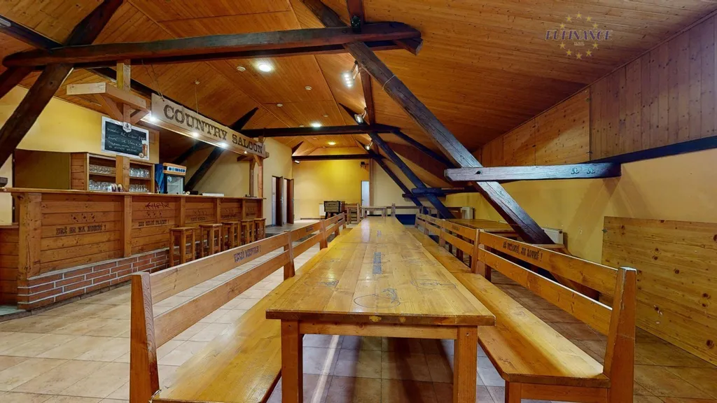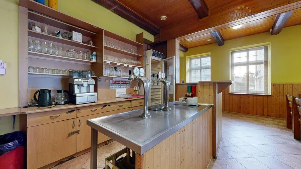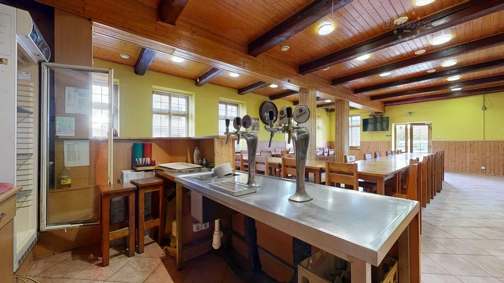 V 1.NP je k dispozici velká prostorná restaurace s barem, kuchyně s dalšími povinnými místnostmi dle hygienických norem, samostatné pánské a dámské toalety, WC pro personál aj. skladovací místnosti. Po točitém schodišti vystoupáme do 2.NP, kde se nachází rovněž velký společenský prostor se stoly, kulečníkovým stolem, velký bar, samostatné dámské i pánské toalety a technické místnosti. Většina objektu je podsklepena a je zde několik technických a skladovacích prostorů.