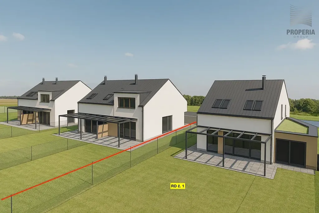 • Technologie a provedení domu: zděný polořadový dům, tepelné čerpadlo vzduch-voda, šikmá sedlová střecha)