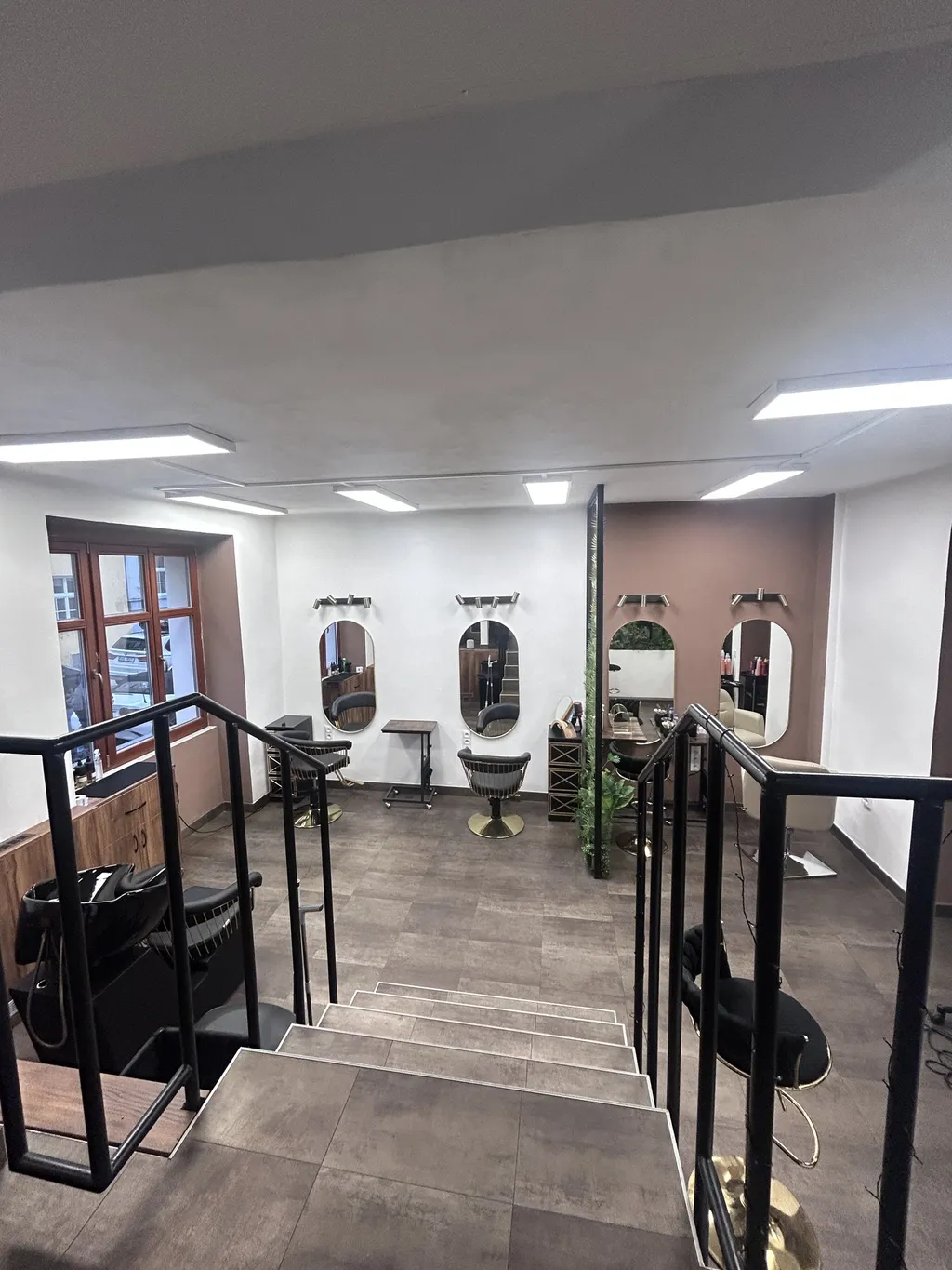 hlavní provozní prostor s kadeřnictvím, zázemí pro míchání barev a sklad