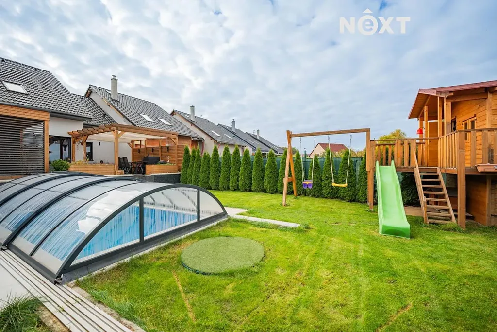 Terasa navazuje na menší, ale útulnou zahradu o výměře 223 m², kde si užijete naprostý klid, soukromí a hlavně dominantu zahrady, kterou je vyhřívaný bazén 5 × 3 m s přístřeškem.