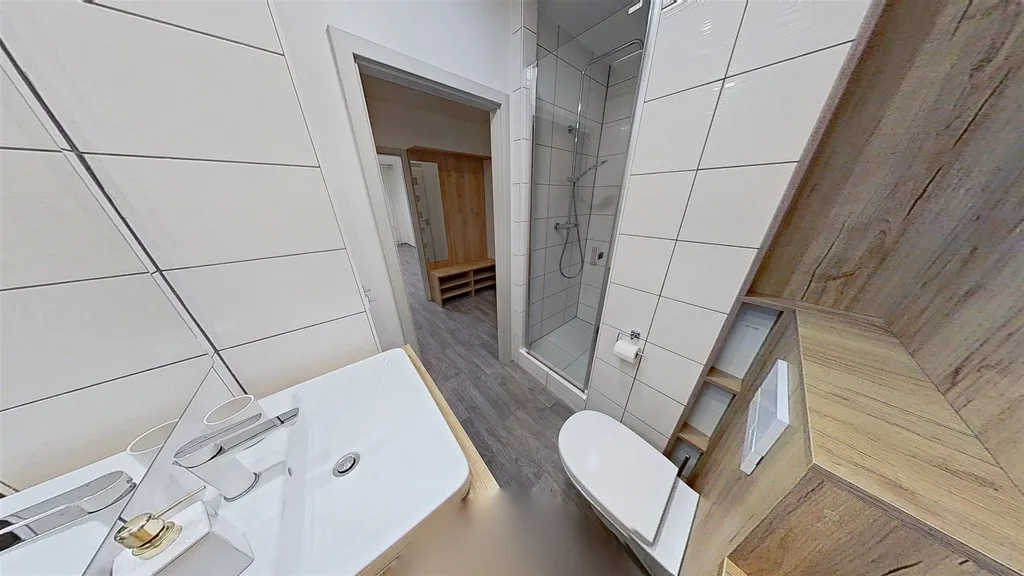 Dispozice: vstup zádveří chodba pokoj 1 (dětský) koupelna se sprch. koutem a WC pokoj 2 (ložnice) s výstupen na lodžii pokoj 3 (obývací) kuchyně prostorná komora (šatna). K bytu dále náleží prostorný sklep v suterénu budovy.