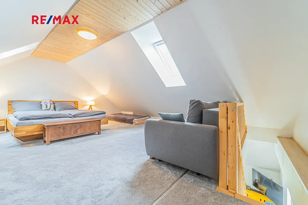 Do zvýšeného patra se jde po dřevěných schodech. Zde se vám poté otevře velký prostor (35 m2), který se dá rozdělit na dvě menší místnosti. Jsou tady dvě střešní okna se žaluziemi, manželská postel, gauč (válenda) a sófa. Celý byt je pokrytý moderní dlažbou, jen v horním patře je položený koberec, který celou místnost zatepluje a zútulňuje.