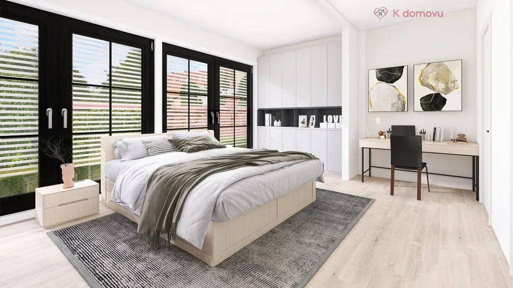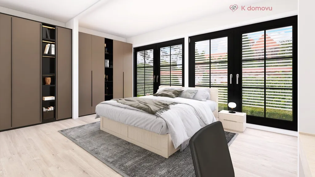 * Francouzská okna: Velkorysá francouzská okna v 1. a 2. NP s přímým vstupem a výhledem do zahrady, prosvětlující interiér a propojující obytný prostor s exteriérem, materiál hliník s trojskly.