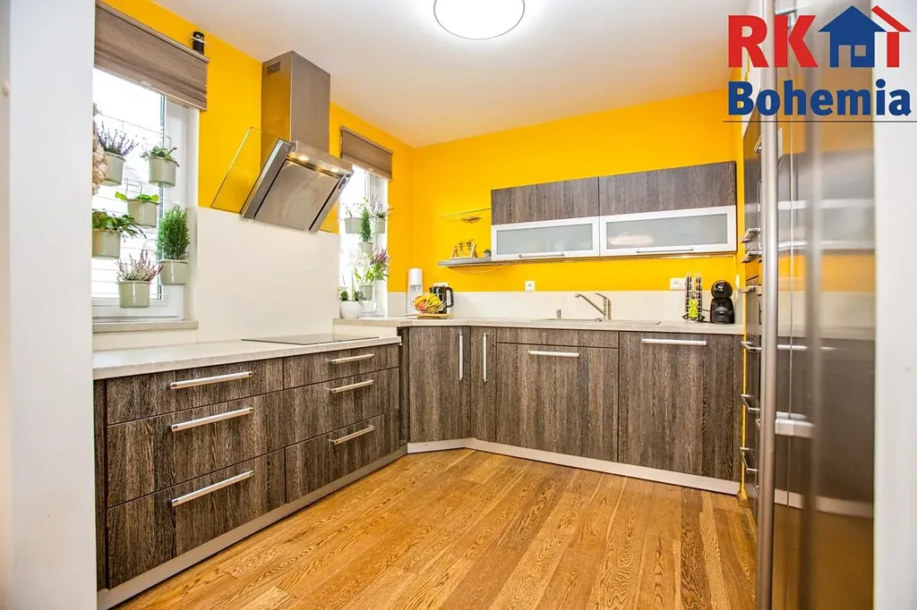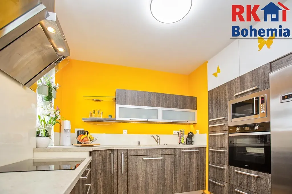 Kuchyně je plně vybavena vestavěnými spotřebiči (indukční varná deska, trouba, mikrovlnná trouba, myčka, digestoř) a praktičnost domu zvyšuje i chytře využitý prostor pod schodištěm, kde se nachází komora se zázemím pro pračku a sušičku.