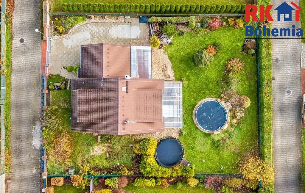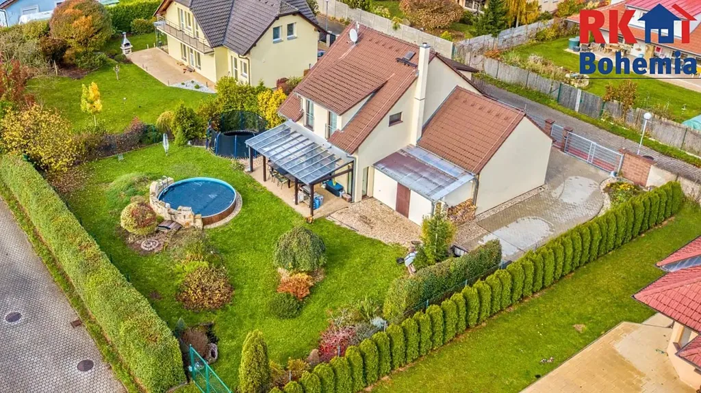 Zahrada je koncipována jako soukromá oáza pro celou rodinu a nabízí bazén i zapuštěnou trampolínu, které jsou citlivě včleněny do okolní zeleně s ovocnými stromy. Klidné bydlení je umocněno umístěním domu v bezpečné obytné zóně a slepé ulici, což minimalizuje okolní provoz.